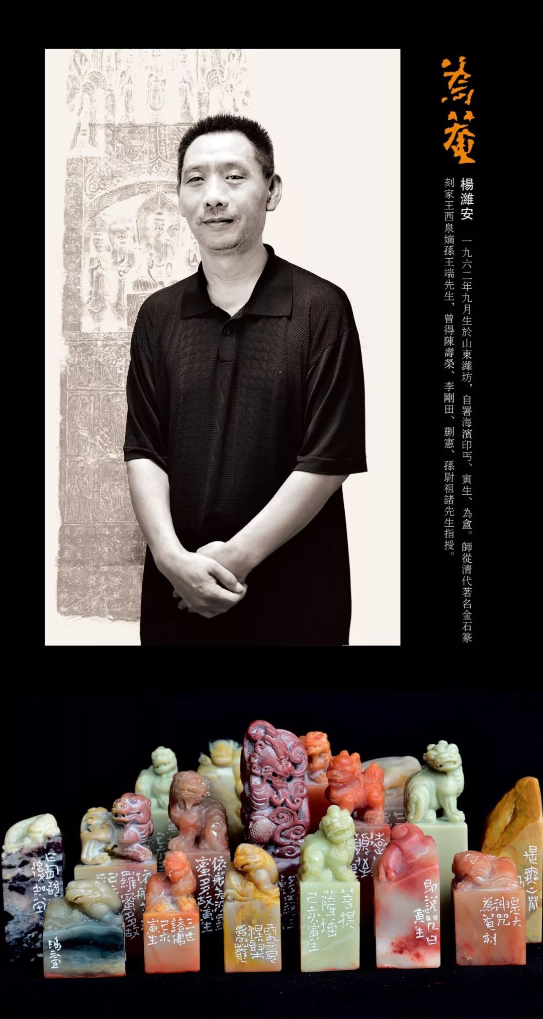 杨潍安,一九六二年九月生於山東濰坊,自署海濱印丐、寅生、为盦。陈介祺研究会副会长。師從清代著名金石篆刻家王西泉嫡孫王端先生,曾得陳壽榮、李剛田、蒯憲、孫尉祖諸先生指授。