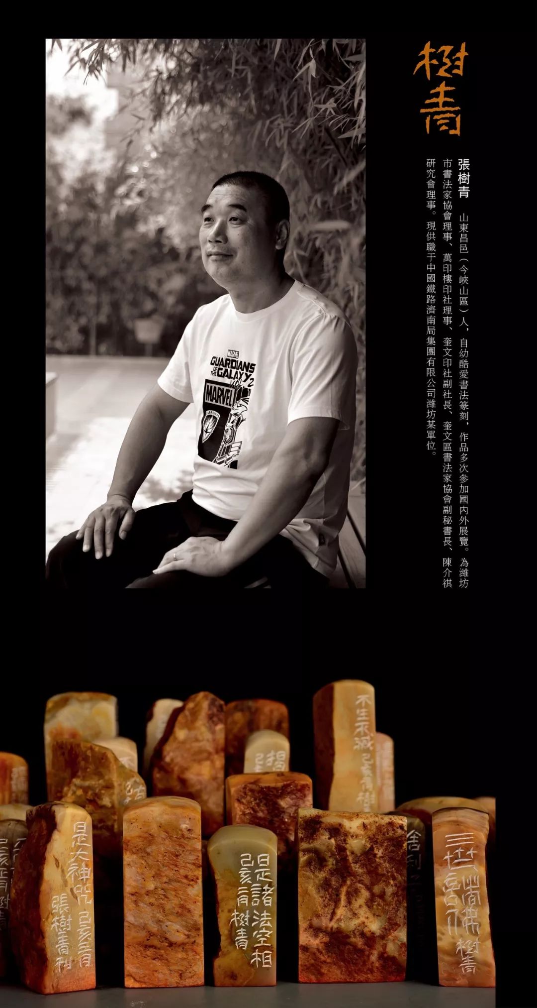 张树青,山东昌邑(今峡山区)人,自幼酷爱书法篆刻,作品多次参加国内外展览。为潍坊市书法家协会理事、万印楼印社理事、奎文印社副社长、奎文区书法家协会副秘书长、陈介祺研究会理事。现供职于中国铁路济南局集团有限公司潍坊某单位。