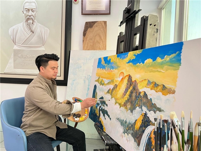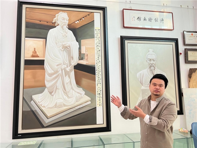 如今,欧阳新光当年的心愿成了真——他成了中国首家诗经美术馆“河间市诗经美术馆”的馆长。开馆那天,他站在馆门口,看着馆内陈列的自己与团队的百余幅作品,每一幅都凝结着这些年的心血,眼眶忍不住发热。这座美术馆不是空架子,而是让《诗经》“活”起来的阵地:植物园与美术馆联动成了研学基地,180多场活动吸引了5300多个孩子来这里看植物、读诗、画画,不少外地学者也专程赶来交流。前阵子在非遗展上做分享,看着台下观众认真聆听他如何用油画诠释“蒹葭苍苍”,欧阳新光真切地觉得,这份事业有了传承的力量。