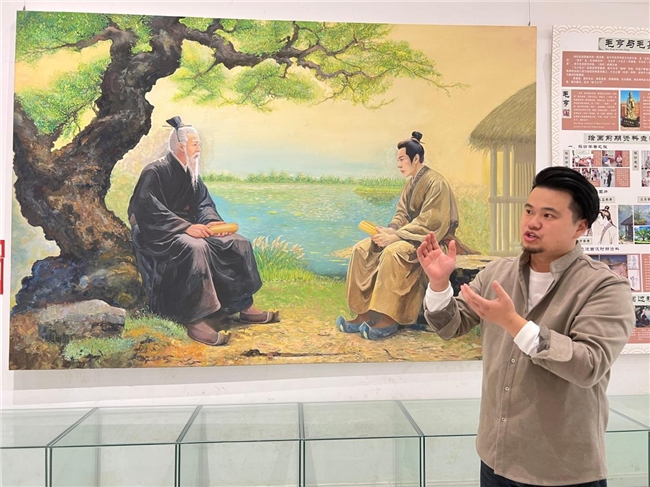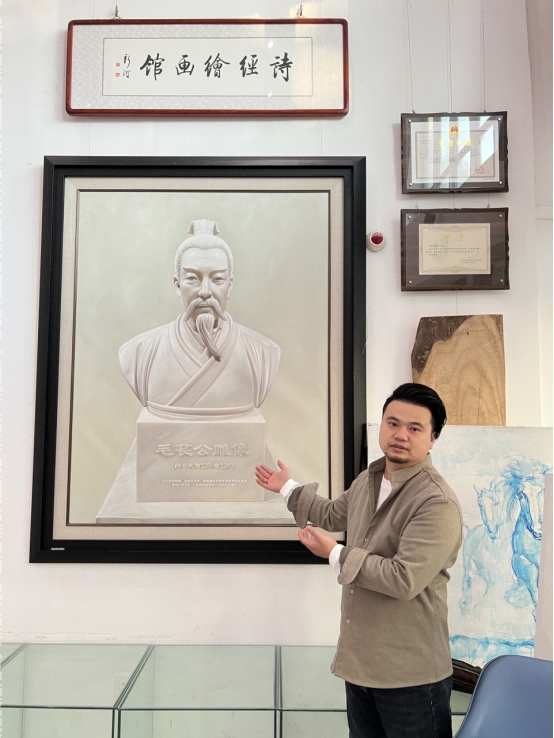 朱亚楠骨子里的诗经情结、岳父朱晓兵对诗经文化的热忱,像润物细无声的春雨,悄悄在欧阳新光心里埋下了种子。在河间,他结识了董杰、李西标等深耕诗经研究的学者,听他们讲毛苌在这片土地上传诗的往事,聊“桃之夭夭”的烂漫、“参差荇菜”的灵动。那些跨越三千年的诗句,不再是书本上冰冷的文字,而是藏着古人喜怒哀乐的鲜活生命。也就是在这时,欧阳新光萌生了用画笔诠释《诗经》的想法,甚至悄悄盼着:要是能有一座专属的美术馆,让这些画作有处安放,让更多人看见《诗经》的美,该多好。