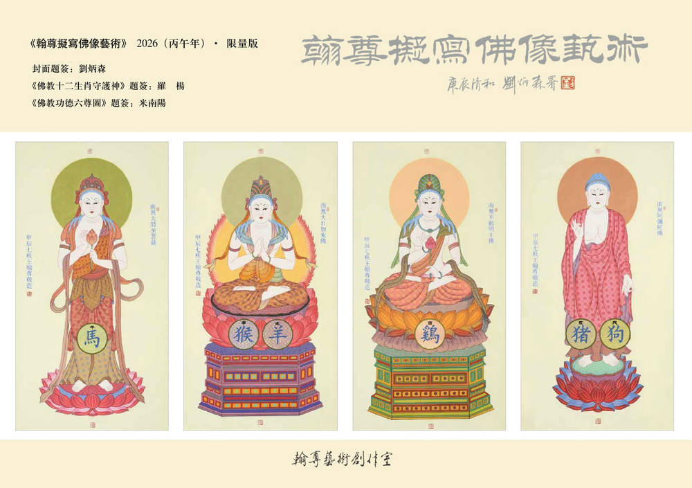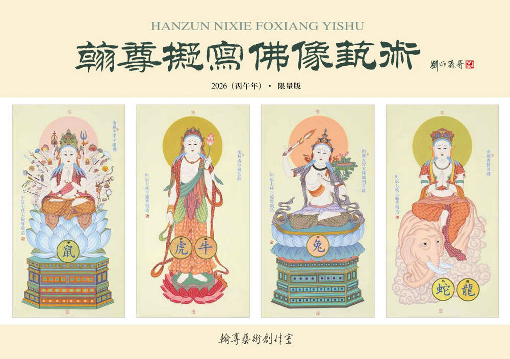 2026(农历丙午年)新年伊始,中国当代佛、神造像艺术家王翰尊将近年创作完成的新版“佛教十二生肖守护神”、“佛教功德六尊图”、“禅标逸韵 梅令人高”(与杨建平合作)、“绿梅观音图”(与杨建平合作)、“南无如意宝珠弥勒尊佛”(与高倬然合作)、“禅界莲香图”等共计18幅精品汇集成《翰尊拟写佛像艺术》2026·限量横幅8开版本专辑(已故全国政协常委、中国文联副主席、中国书法家协会副主席、中国佛教协会副会长、著名书法家刘炳森题签),由北京工艺美术出版社精心设计、印制出版。