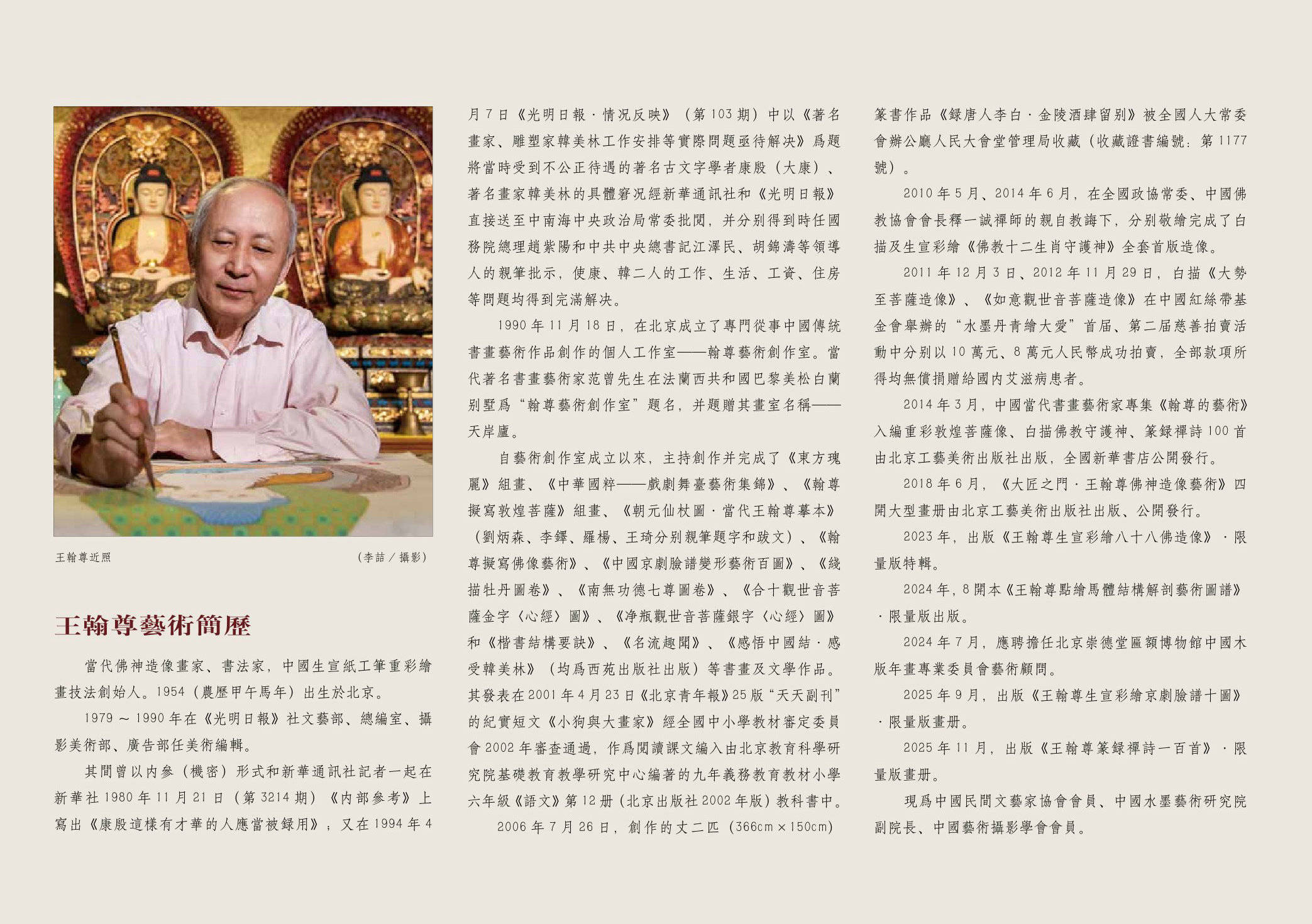 专辑的佛像作品前面选刊了和王翰尊有着几十年友情的启功、王琦、于志学、单国强、范曾、米南阳、卢奇、孙瑞祥、胡建雄、郭创、宿悦等知名书画家的致贺题词。