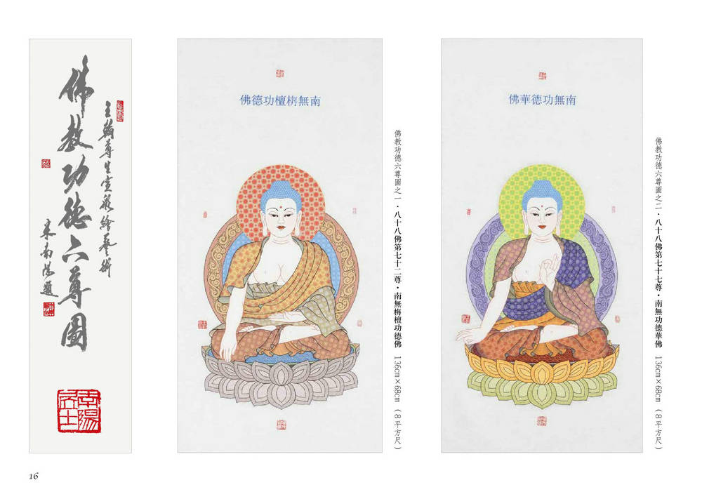 除此之外,王翰尊还把佛教“八十八佛”中带有“功德”名称的六尊佛像单独绘制成《佛教功德六尊图》组画,内容是:八十八佛第七十二尊南无旃檀功德佛、八十八佛第七十七尊南无功德华佛、八十八佛第七十九尊财功德佛、八十八佛第八十一尊善名称功德佛、八十八佛第八十三尊善游步功德佛、八十八佛第八十六尊周币庄严功德佛。嗣后的两幅作品是王翰尊和冰凌梅花画派创始人、军旅画家杨建平合作完成的红梅、绿梅与观音菩萨结合的创新题材。而《南无如意宝珠弥勒尊佛》则是由高倬然在王翰尊画的小弥勒坐像上题写“佛佑天下”横额诗唐后二人的合作以及王翰尊在“范曾专用纸”上以其独具风格的生宣纸工笔重彩技法绘成的观音菩萨半身像《禅界莲香图》……