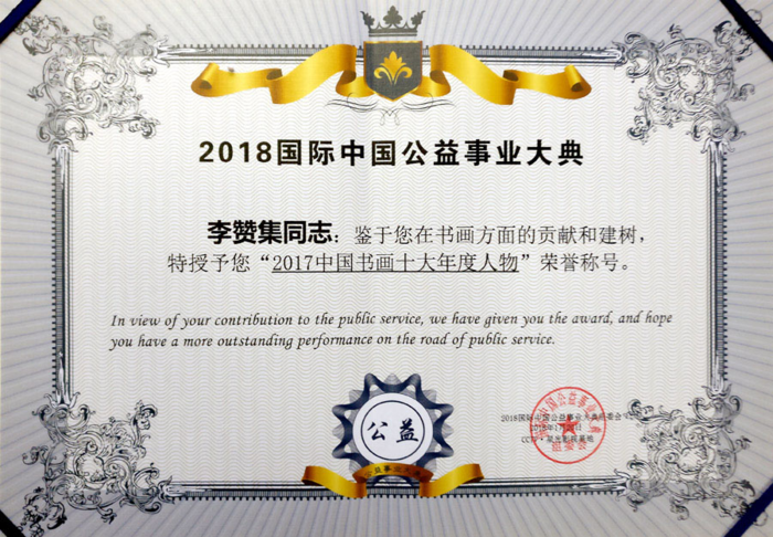 2018年1月20日国际中国公益事业大典颁奖在北京中央电视台・星光影视基地隆重举行,著名书画家、中国书画印研究院院长,中国剑光书画院院长,中国书画名家网主席,国家一级美术师、北京萃雅香苑国际书画艺术研究院荣誉主席、中国硬笔书法协会会员、香港文联美术家协会会员、香港文联书法家协会会员、广东省陆河美协主席李赞集先生,近年来,在推动海峡两岸文化艺术交流和慈善献爱心、爱国拥军等活动中做出了卓越成就和贡献,在国内外产生深远的影响,深受党和国家政府部门领导的高度重视与关注,并得到社会各界的赞誉与好评,在2018国际中国公益事业大典中被国际中国公益事业大典组委会评为“2017中国书画十大年度人物奖”并对获奖者李赞集颁发了证书和奖杯。