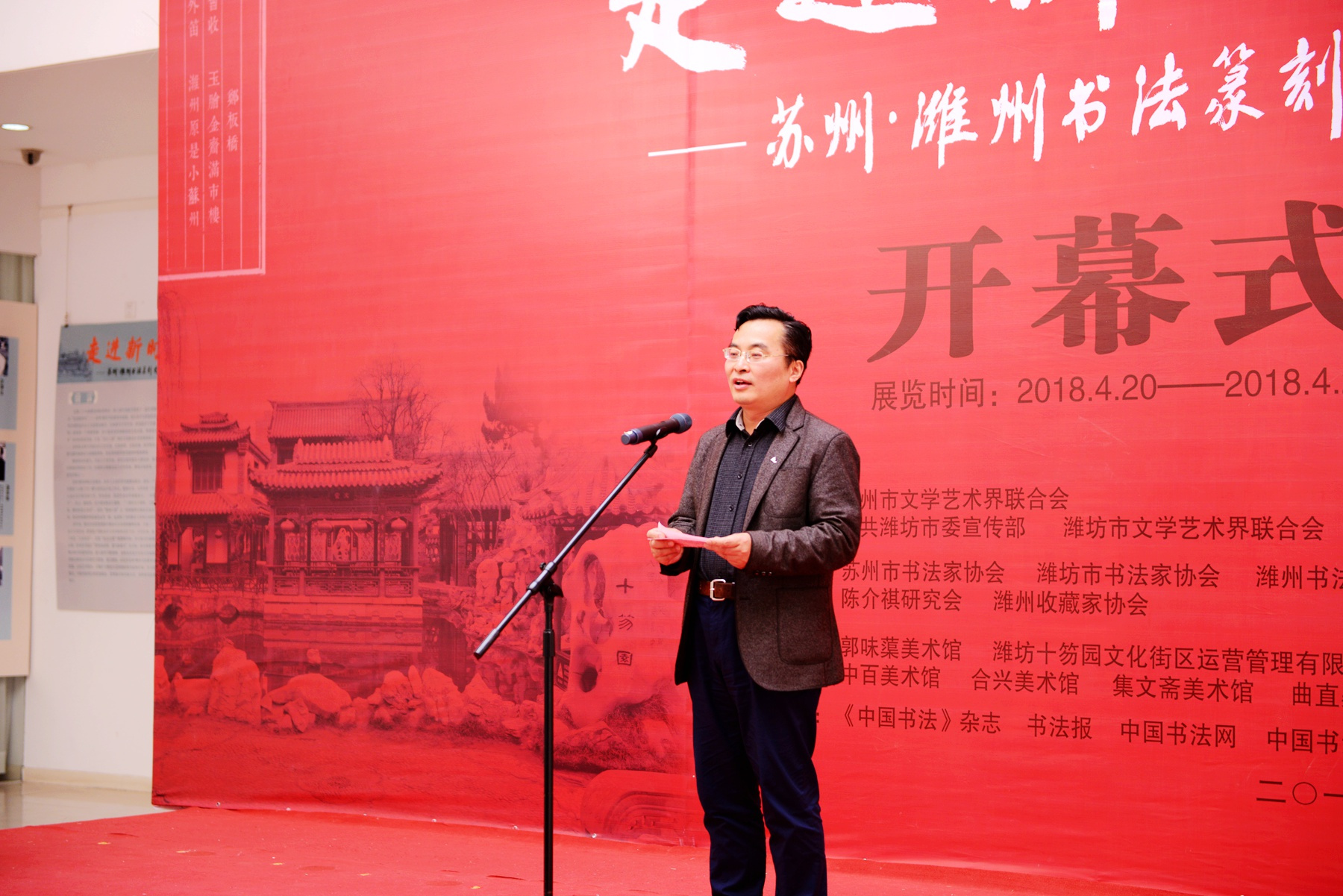 鸢都四月,芳华初上,书写新篇章,放飞新梦想。为新时代书写新篇章,坚定文化自信,提升“金石之都”城市文化品牌。由江苏省苏州市文学艺术界联合会和山东省潍坊市文学艺术界联合会主办,苏州市书法家协会和潍坊市书法家协会、潍州书法家协会、潍州收藏家协会、陈介祺研究会联合承办的“走进新时代”——苏州·潍州书法篆刻交流展开幕式和学术研讨会于2018年4月20日在“金石之都”潍坊郭味渠美术馆隆重开幕!展览共展出苏州、潍坊两市63位实力派书法篆刻家精品力作126件。