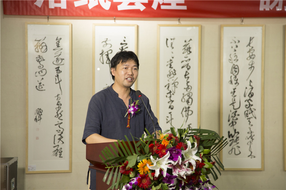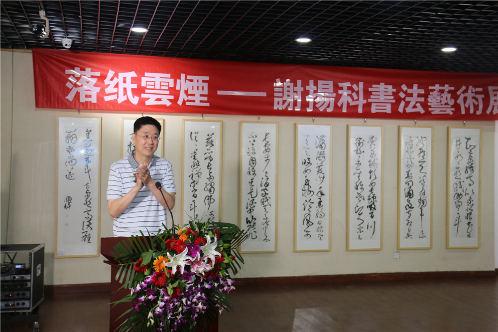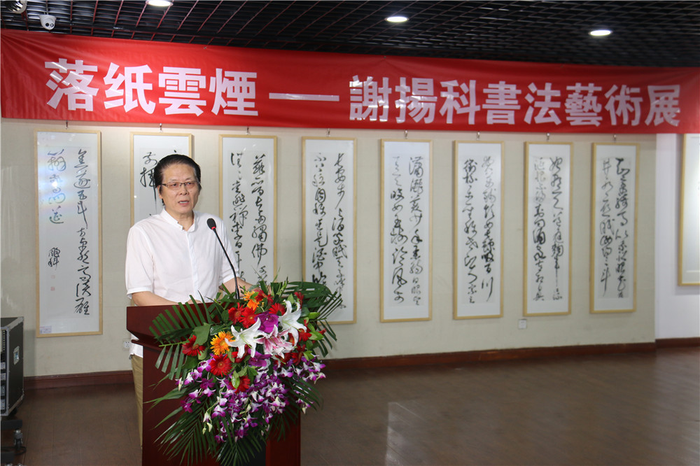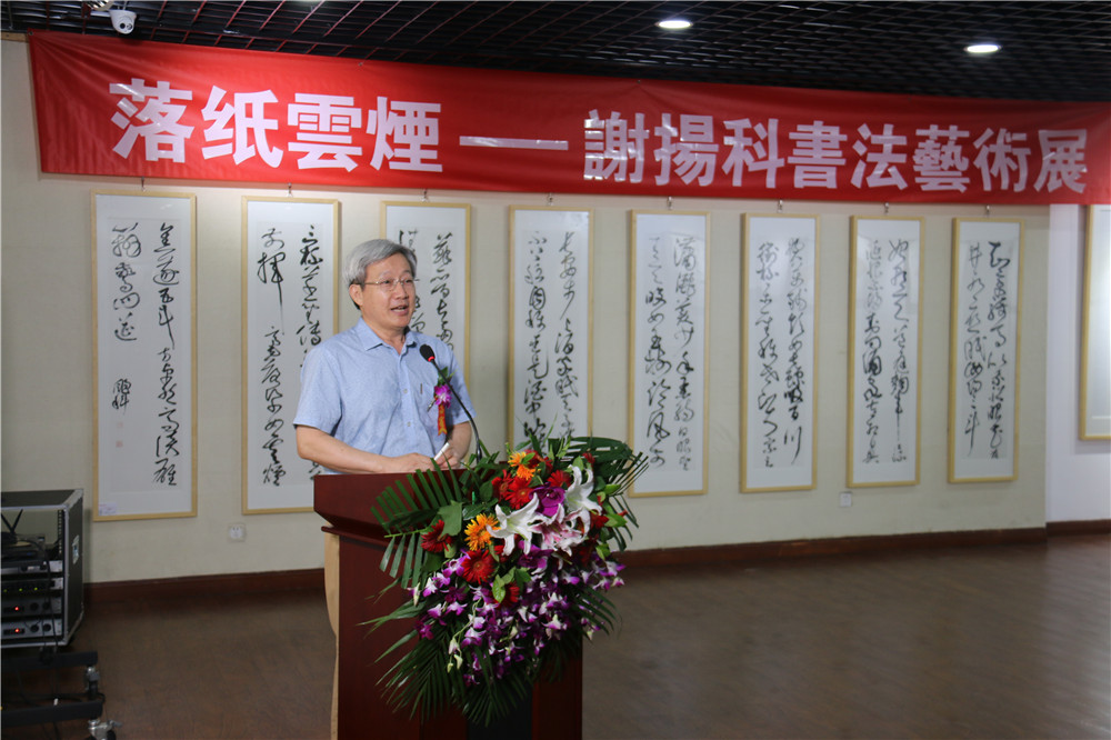 在开幕式上主办方代表中国书协中央国家机关分会副秘书长、北京市东城区书协驻会副主席高风首先致辞祝贺。随后,中国书法家协会理事、北京市书协副主席杨广馨先生讲话,他说:谢扬科的书法以篆隶为根基,以行草写性情,涉及篆、隶、楷、行、草五种书体,秉承传统,敬畏经典,同时此次展览举办时间非常好,是对当下 “丑书风”书法现象的最好回击,给首都带来了一场正能量的艺术盛宴。