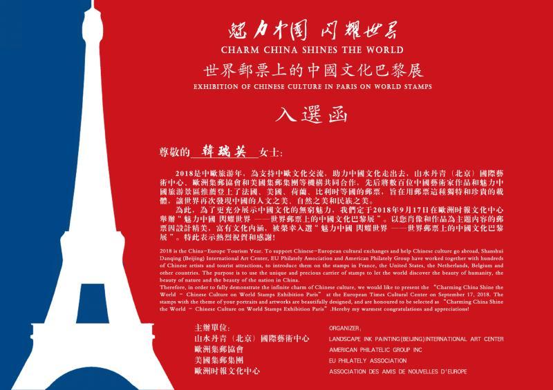 恭喜韩瑞英老师邮品入选《世界邮票上的中国文化法国巴黎展》法国巴黎欧洲时报文化中心将于9月17日隆重开幕