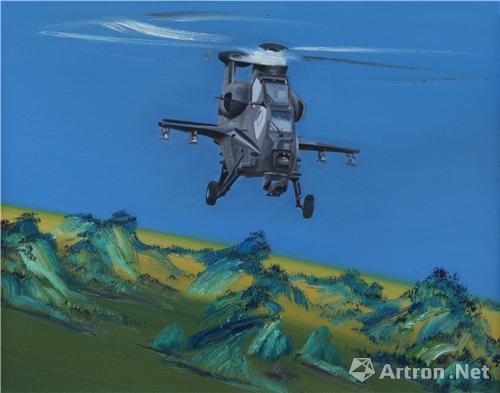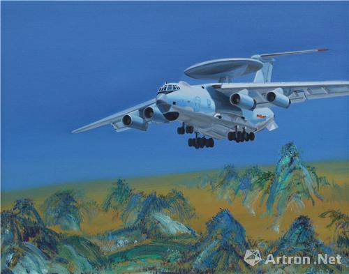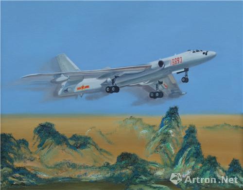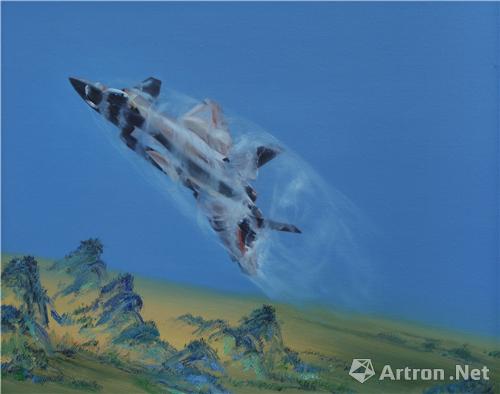 而在这些大美画卷中,艺术家作为核心元素——表达这些作品的艺术精神的中心符号,却是各式各样的飞机。例如,在《千里江山》系列油画作品中,由十二幅气势恢宏、雅丽极致的青绿山水图,加上十二架精心挑选的、矫健飞翔的大飞机(几乎全是中国当代最先进的机型)。这种惊鸿的图像结构,大胆的造型特征,恍如幻境的画面语言,它们承载的不是审美,也不是艺术家个人的内心世界,而是中国人的时代精神。作为文明史上不断穿越人类生存与时空极限的造物和航空工业成就,飞机等航空器有的犹如回荡在天地间的生命史诗,有的犹如民族不不跨的脊梁,有的犹如神勇无比的钢铁意志,有的犹如一路高歌、昂扬奋进的急行军……也就是说,他那种自由挥洒,已经超离大美画卷和飞机的惊鸿之美。