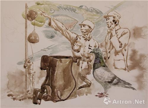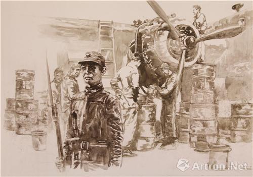 为了深入刻画好这些场景,他通过学习、走访老兵加深理解时代、史实,虽依据照片但必须进行大量的艺术处理才能成为画作,这项工作的艰辛也只有画家才能理解。他在一幅画中常用的手法是同时呈现多个场景来烘托主题,采用蒙太奇手法多视角、多时空集中呈现事件情节,不仅增加了更多的细节,也使画面更耐看。为增添绘画的趣味性,画前他在素描纸上用棕色水彩做了浅浅的肌理,斑驳的纹路使画面更具历史的沧桑感,这个办法效果非常好。这种水色淋漓的绘画味道是一个特别值得认真研究的艺术语言,形体在混与清、虚与实中产生了极强的艺术效果。
