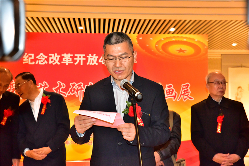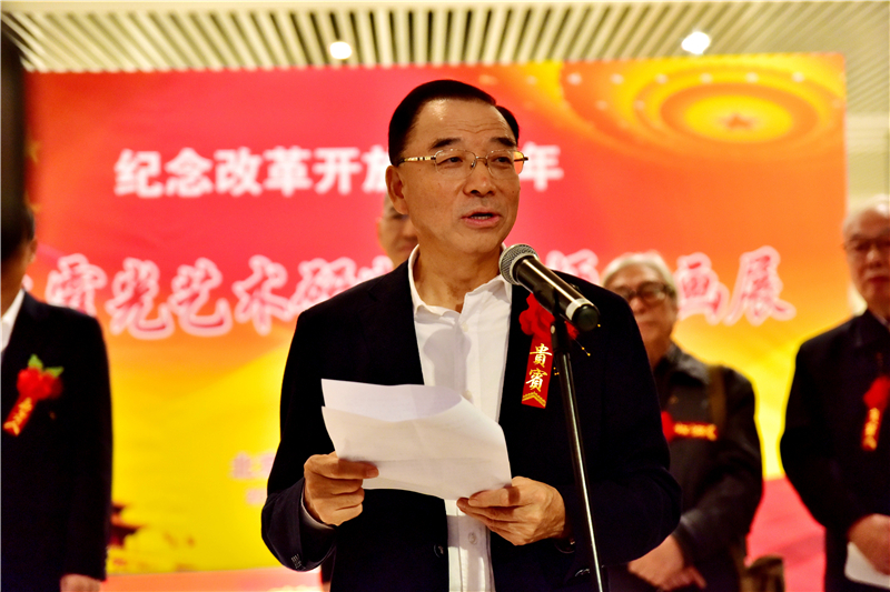 中共东城区委常委、宣传部长周家雷为书画展致辞。他说,在这硕果飘香收获满满的金秋时节,在祖国大江南北隆重欢庆改革开放40周年的喜庆时刻,“纪念改革开放40周年北京霞光艺术研究院导师书画展”今天在这里举行开幕仪式。我代表东城区委、区政府表示热烈祝贺。北京市东城老年大学是1985年经东城区人民政府批准成立的,当年一大批离退休老领导、老同志四处奔波,艰苦创业,付出了巨大的心血。建校33年来,在历届区委、区政府的关怀和领导下,经过30多年的发展,学校已形成10个专业,98个教学班的教学格局,在校学习的学员保持在4700余人次,先后被评为“北京市东城区老龄工作先进集体”“北京市东城区老龄工作标兵单位”“北京市示范老年大学”“全国先进老年大学”“全国示范老年大学”等荣誉称号,成绩来之不易,经验弥足珍贵。希望再接再厉,争取更大成绩!预祝画展圆满成功!