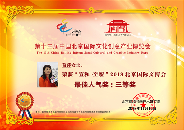 环球文化艺术网(杨东亮 报道): 2018北京国际文博会“宣和·至臻”书画邀请展“最佳网络人气奖”评选结果出炉啦!本次活动共计51位艺术家参加,历时六天,共计投票179832票,总浏览量达到1978155次,画家葛萍老师以9563票位居第三名,荣获2018北京国际文博会“宣和·至臻”邀请展最佳网络人气奖:三等奖。