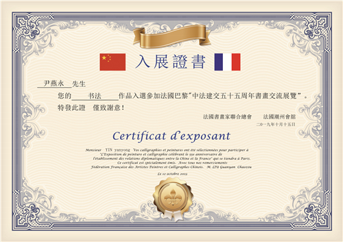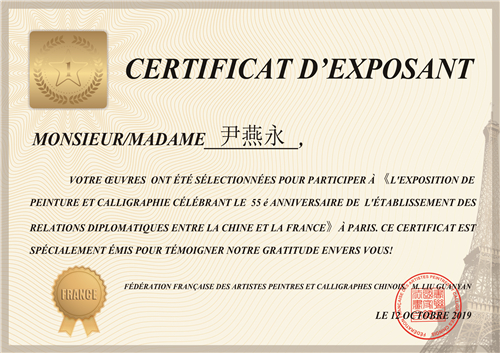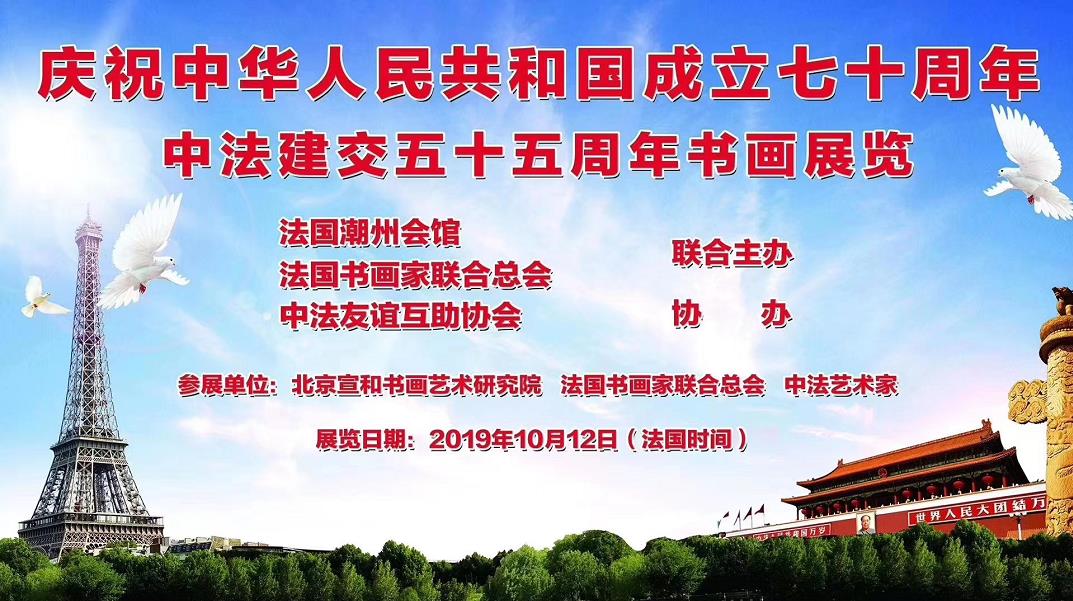 法国当地时间10月12日14时,由北京宣和书画艺术研究院、法国书画家联合总会、法国潮州会馆主办,飞驰环球文化传播集团、法国中法友谊互助会协办的,为庆祝2019中法建交五十五周年暨“飞驰环球”书画名家巴黎邀请展在法国巴黎潮州会馆隆重举行, 著名书法家尹燕永老师作品亮相此次画展。