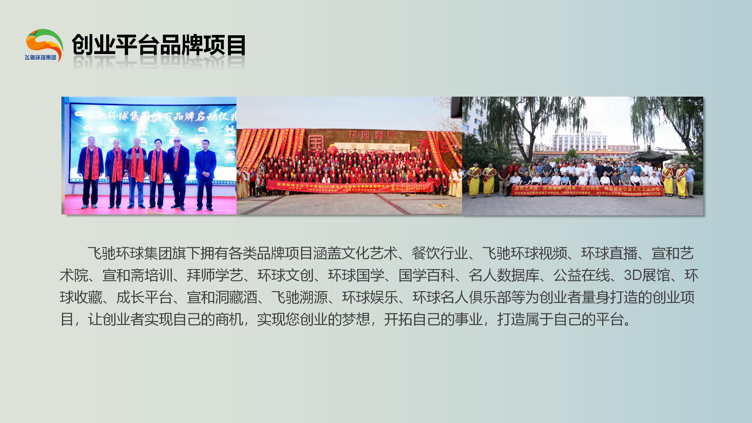 飞驰环球集团旗下拥有各类品牌项目涵盖文化艺术、餐饮行业、飞驰环球视频、环球直播、宣和艺术院、宣和斋培训、拜师学艺、环球文创、环球国学、国学百科、名人数据库、公益在线、3D展馆、环球收藏、成长平台、宣和洞藏酒、飞驰溯源、环球娱乐、环球名人俱乐部等为创业者量身打造的创业项目,让创业者实现自己的商机,实现您创业的梦想,开拓自己的事业,打造属于自己的平台。