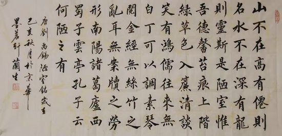 田兰生自幼勤奋好学,在学校中很早便展现出书写上的天赋;初中时的书法启蒙老师、书法大家冯大彪先生很喜欢他,于是将他介绍给了自己的老师,著名书法大家康伯藩老先生。当时康先生已经年过古稀,也非常喜欢这个后生,经过一段时间的接触后,收其为关门弟子。就这样从此以后十二年间,田兰生风雨无阻,每逢节假日必至康府聆听先生教诲。早年跟随先生临习王羲之、李邕、颜真卿、柳公权、欧阳询、赵孟頫楷书,风格中既有颜柳之筋骨,又含赵孟頫之俊秀。其作品虽曾多次在军博、首博、民族、政协以及日本东京、英国伦敦等国内外展馆展出,也受到亲朋友人的追捧,但仍不敢妄为,时刻铭记康先生教诲:“出名与献丑并存,广杰益友,勿入江湖。”